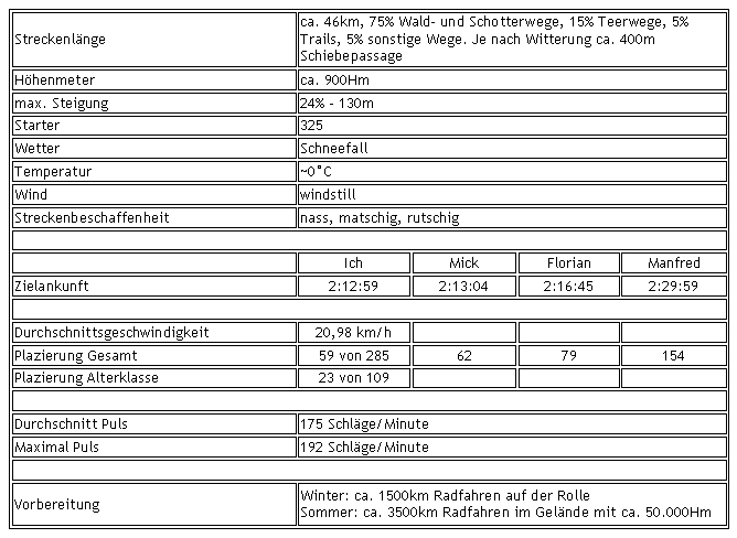 Das war aus meiner Sicht mit Abstand das härteste Rennen für Mensch und Material. Über Nacht hat es ein wenig geschneit, sodass die Wiesen leicht mit Schnee bedeckt waren. Noch beim Frühstück, als ich laufend aus dem Fenster nach dem Wetter sah, schneite es vor sich hin. Mein Eindruck war, dass der Schneefall immer heftiger wurde, je mehr es an den Starttermin ging.
